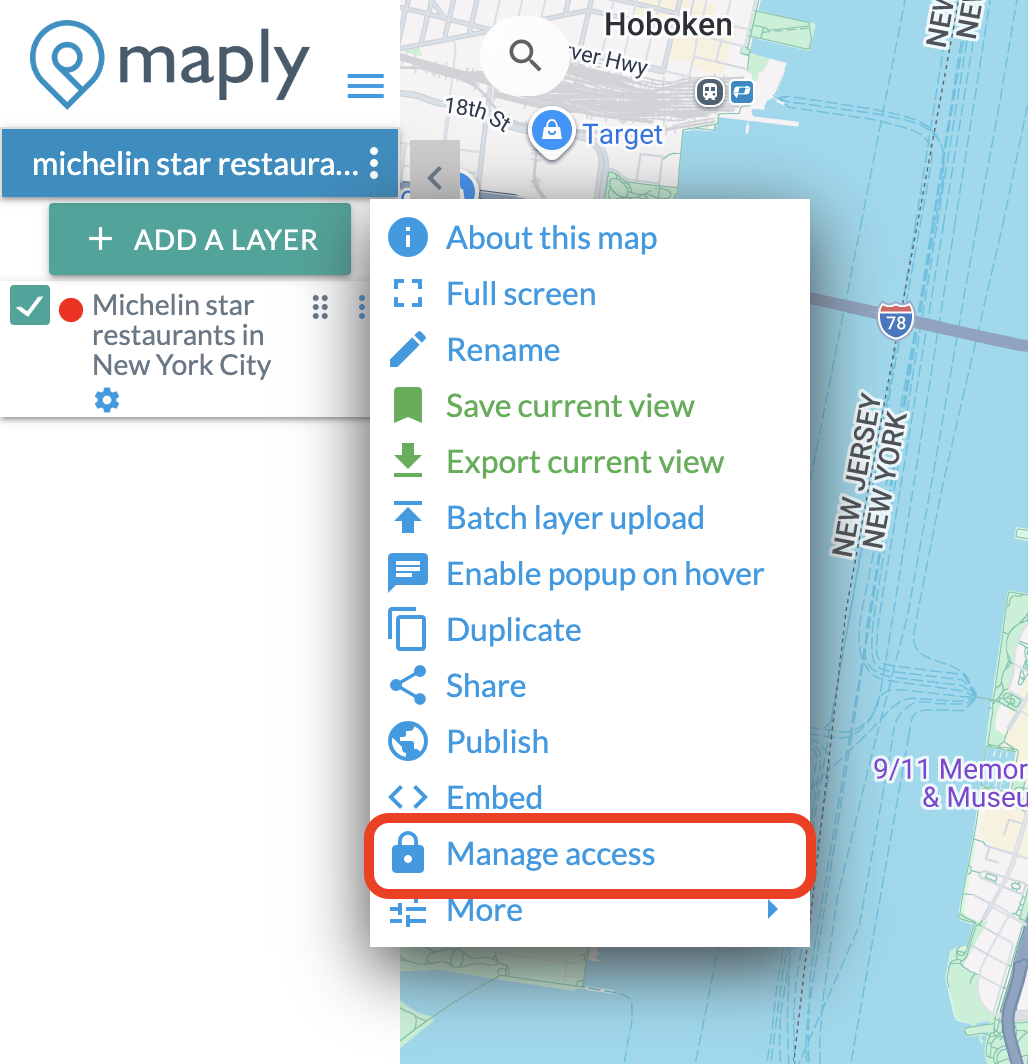 To publish your map, click the three-dot icon next to the map title, and you will see the “Manage access” option, as shown in the image below.