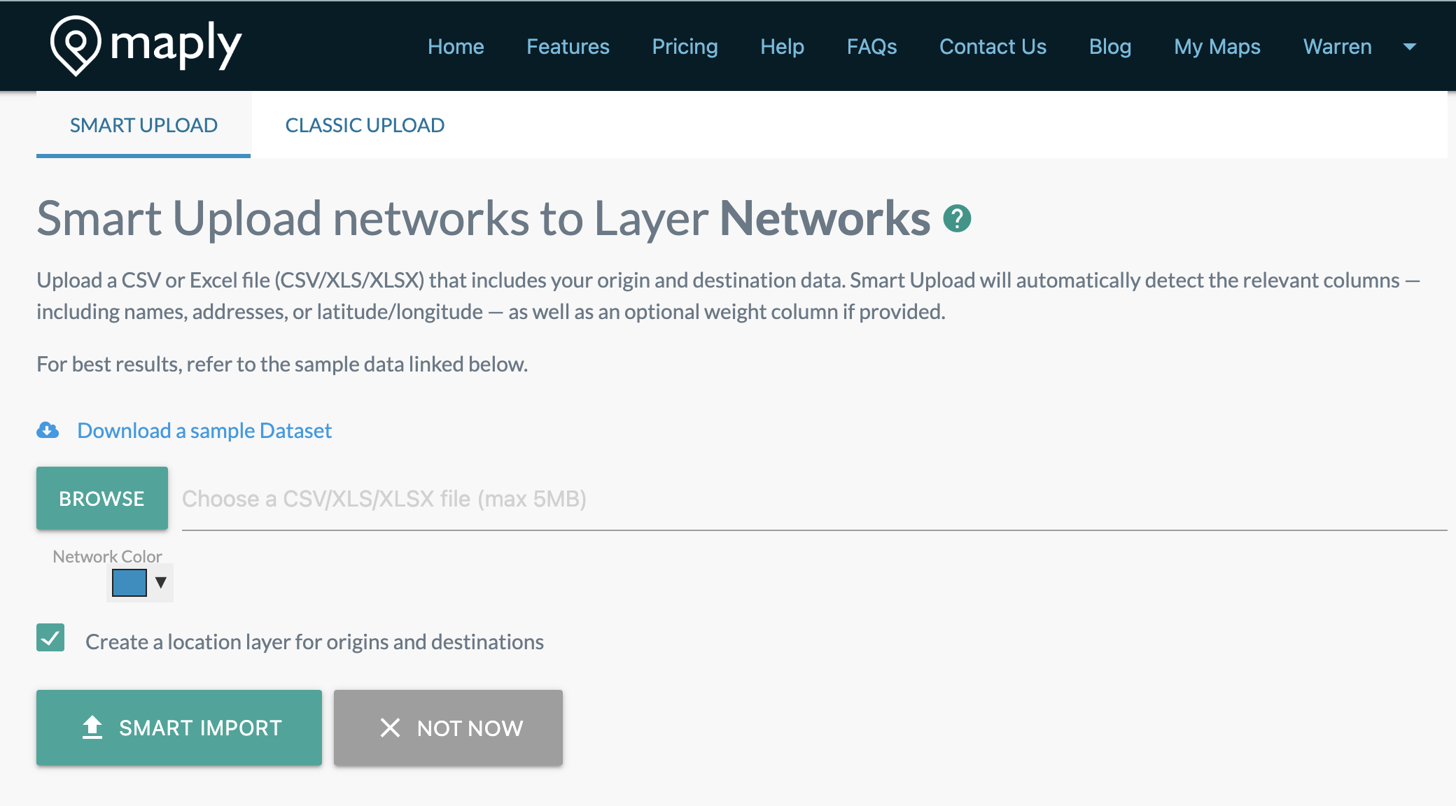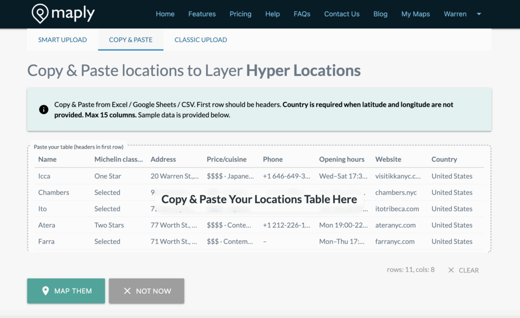 Now when you want to make a new hyper location map, network map or a radius/bubble Map, you can use Smart Upload to upload your data into Maply without the hassle of having to use the template.
