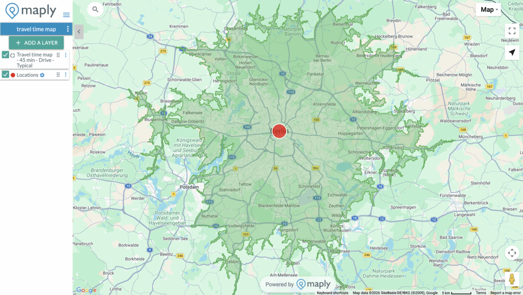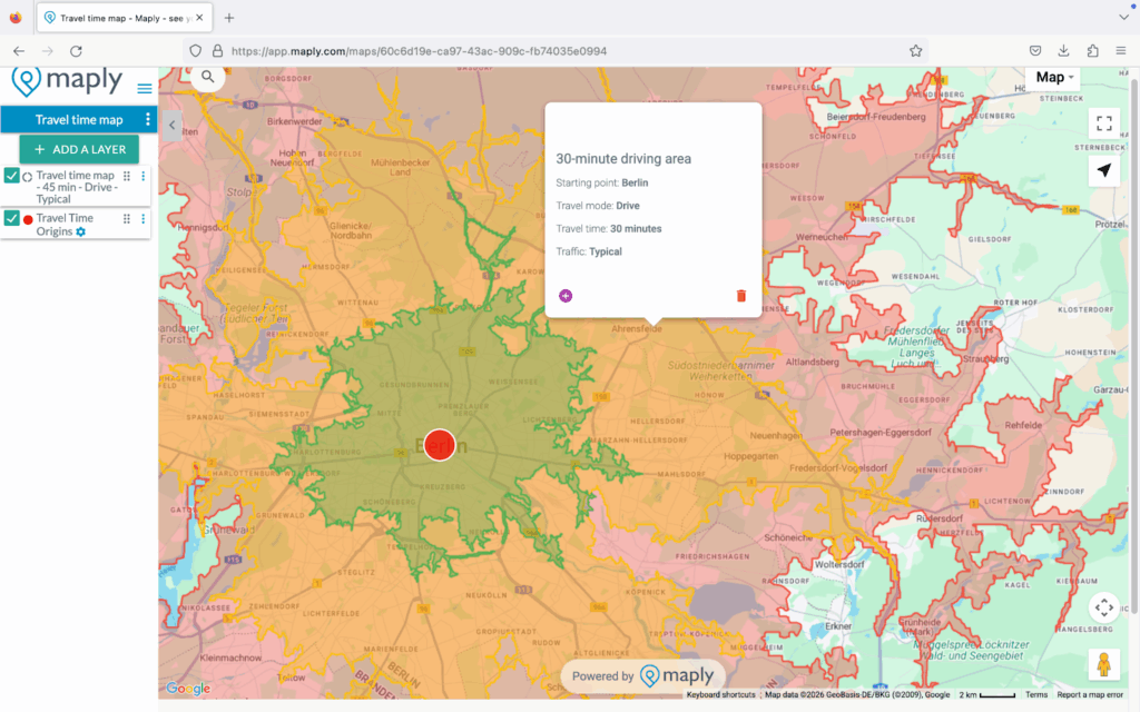 Maply instantly generates color-coded zones showing how far you can reach, from green (closest) to red (outer boundaries).