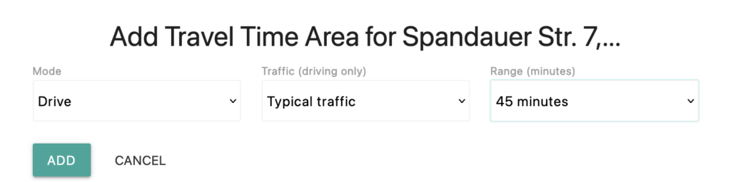 Select any location on your map and click the purple donut icon to add travel time area. A window will pop up to ask for your requirements.