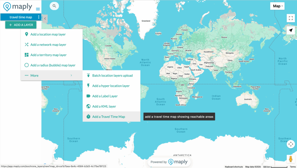 Click the βAdd a Layerβ button, select βMore,β then choose βAdd a Travel Time Map.β