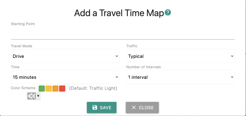 Select your starting location, choose your travel mode, Traffic, Time, and Intervals, then click βSave.β If you want, you can even choose the color gradient. Refer to plan comparison for available options under different subscription plans.